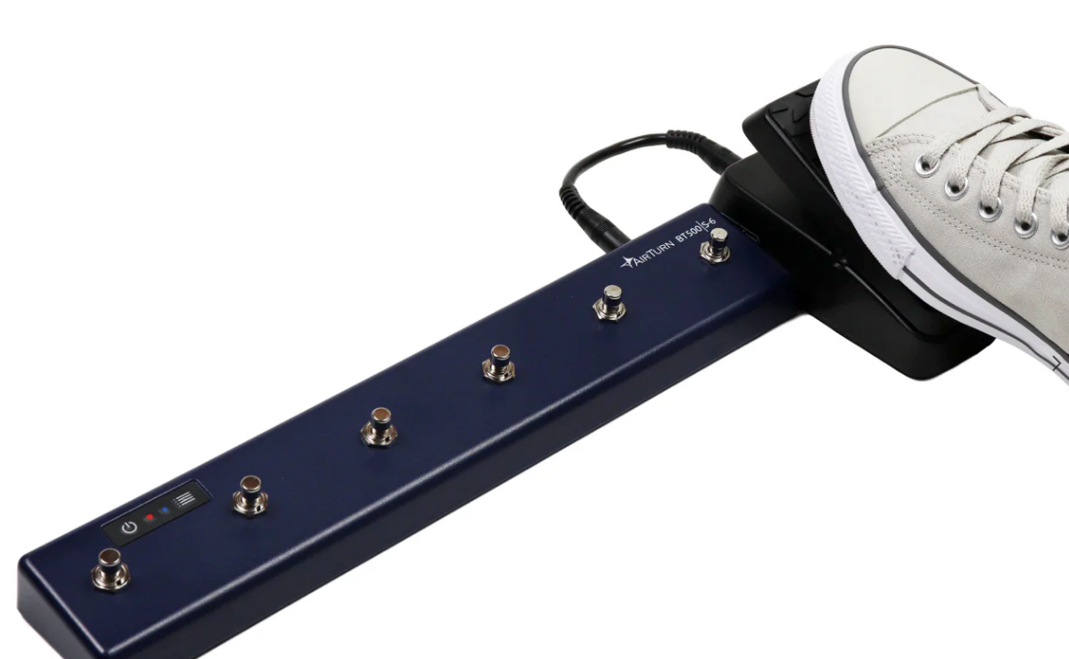 Featuring a durable stompbox design and complete with quiet steel switches, the AirTurn BT500S-6 easily integrates into a pedal board setup and is powered by a rechargeable battery or optional 9v power supply. It now includes two 1/4"analog inputs for adding pedals that can be programmed to control variable parameters, such as volume, wah effects, or scroll speed!