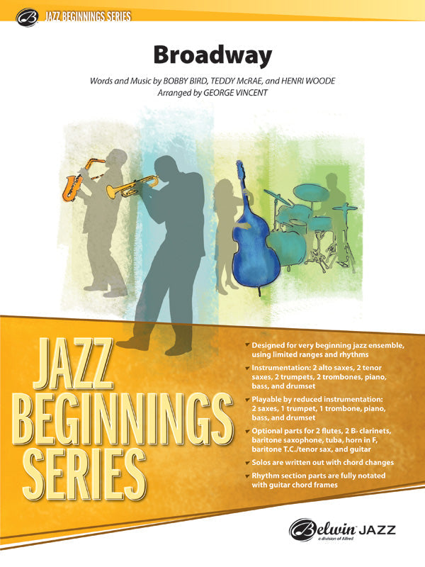 It's a swing chart for beginning jazzers with an AABA form, a very easy melody, and a simple bridge. This one has basic rhythm swing figures, a nice ensemble shout chorus, and no individual solos. The ranges are very accessible and the rhythm section parts are well-notated.