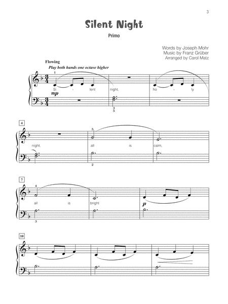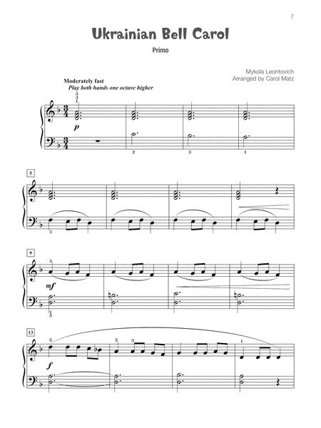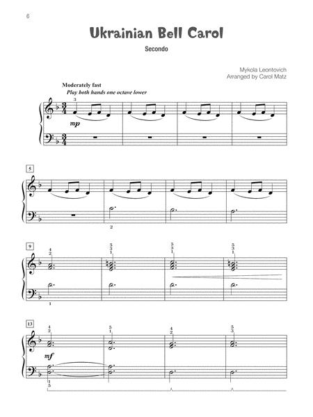 Famous & Fun Christmas Duets, Book 3, contains 6 timeless carefully graded elementary to late elementary Christmas-season favorites. These works have been artfully arranged and balanced for two evenly skilled players. Titles: Dance of the Sugar-Plum Fairy (from The Nutcracker) * Deck the Halls * Ding, Dong, Merrily on High * Silent Night * Ukrainian Bell Carol * We Wish You a Merry Christmas.