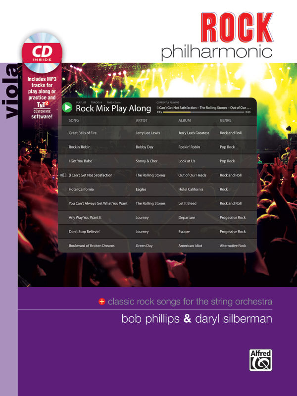 This collection of nine "classic" Rock tunes spans five decades of rock history. The arrangements in Rock Philharmonic contain complete versions and lead sheets of original hit songs by top groups and artists: Jerry Lee Lewis, Bobby Day, Sonny and Cher, The Rolling Stones, The Eagles, Journey, and Green Day. Each piece includes a flexible arrangement that allows the melody, harmony, and bass parts to be played by all sections in the string orchestra, like or mixed instrument groups, quartets, or trios---allowing players to learn the component parts of rock and roll, play the classic arrangement, create their own arrangements, or perform the tunes solo. In addition to string orchestra, the arrangements are also set for electric strings with optional guitar/electric guitar, piano, and drumset. The student book contains a full-length, two-page play thru version of the melody, which follows closely the original recording and includes clearly labeled Intro, Verse, Chorus, Bridge, and Outro sections. The bass and harmony component parts are then presented in a lead sheet format, along with a flow chart that matches the order of the Melody Line Play Thru. The teacher's book contains a full score and reproducible piano and percussion parts. Guitar chords appear in all parts. For easy practice, the accompanying CD has two tracks for each piece---a complete track and a backing track---and TNT 2 software to mix the level of each instrument, change pitch, change tempo, and create loops. The CD can also serve as an aid to learning by ear. Titles: Great Balls of Fire * Rockin' Robin * I Got You Babe * (I Can't Get No) Satisfaction * Hotel California * Any Way You Want It * Don't Stop Believin' * Boulevard of Broken Dreams * You Can't Always Get What You Want.