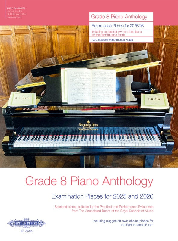 The Grade 8 Piano Anthology 2025–2026 comprises a broad selection of examination pieces from lists A, B and C of the ABRSM syllabus, together with a valuable selection of fascinating repertoire suitable for the own-choice section of the Performance Exam.