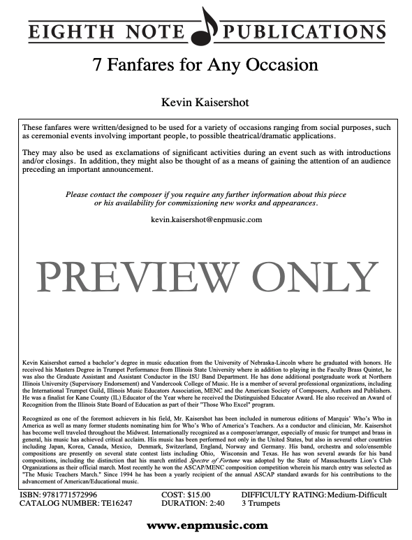 "7 Fanfares for Any Occasion" were written by Kevin Kaisershot and designed to be used for a variety of occasions ranging from social purposes, such as ceremonial events involving important people, to possible theatrical and dramatic applications. They are each short and in a variety of styles and keys.