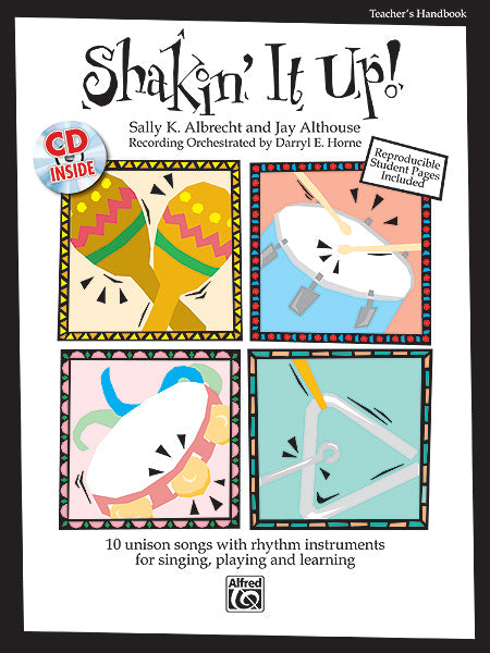 If you can read it rhythmically, you will be stronger musically. That's the premise of this focused songbook which introduces your students to 10 popular rhythm band instruments and the typical rhythms they play. Have some students sing, some play along---then trade! Products available: Teacher's Handbook (includes Reproducibles), Enhanced SoundTrax CD (Accompaniment/Performance tracks plus reproducible PDF files of Student Pages & Cover Art), or price-saving Book & CD Kit. Titles: Shakin It Up! (Shakers) * OlÈ (Castanets) * Hit Those Sticks (Rhythm Sticks) * A Crash Course (Cymbals) * It's Time for Dinner! (Triangle) * Tick Tock (Woodblock) * Rum ba da Dum Bum Bum (Drum) * Shake My Maracas (Maracas) * The Old Soft Shoe (Sandpaper Blocks) * My New Tambourine (Tambourine).