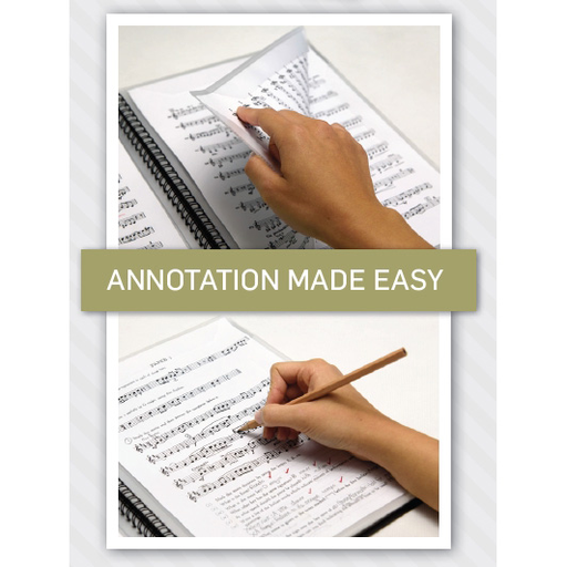 Rondofiles securely store your sheet music while eliminating glare for easy reading in any environment. Their patented retaining tabs hold sheets in place around the edges, leaving the center free for easy annotation of fingering, expressions, or notes.