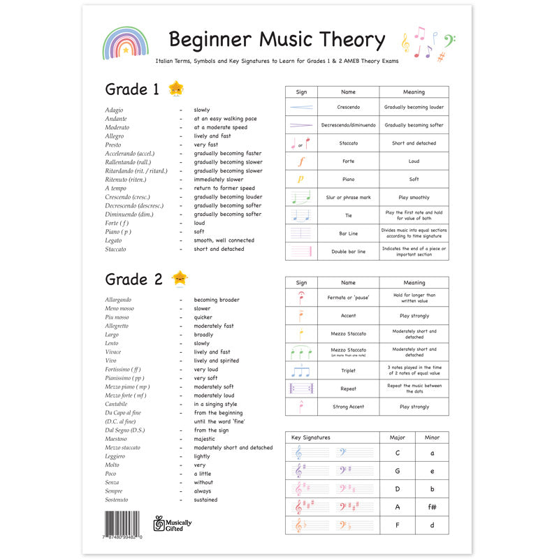 The chart now includes a beginner theory poster on the back, featuring all the key music terms, symbols, and keys you'll need to know for AMEB Theory Grades 1 and 2. Once the practice chart is complete, simply flip it over and display the poster on your wall as a handy reference tool.