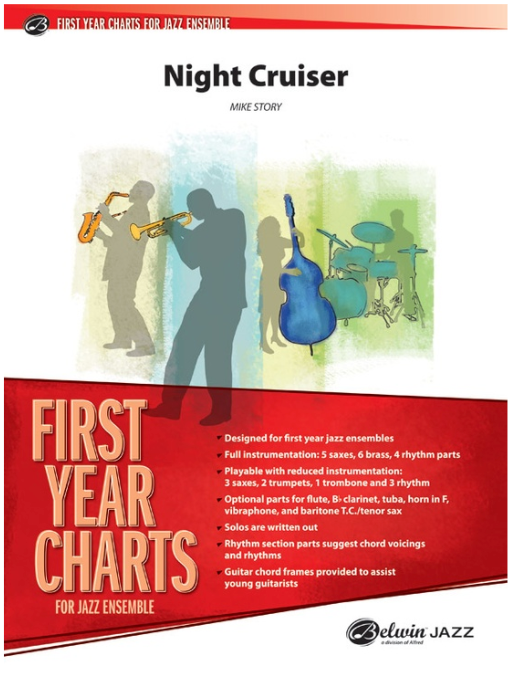 "Night Cruiser" is an original swing chart with a tempo around 148 BPM featuring a written trombone 1 solo. The trumpet 1 range is up to written E top space and optional parts are included. Here's a very nice chart that will make your band sound great! (2:40)